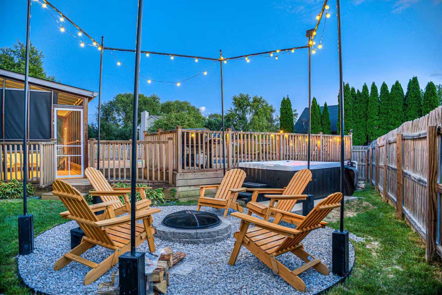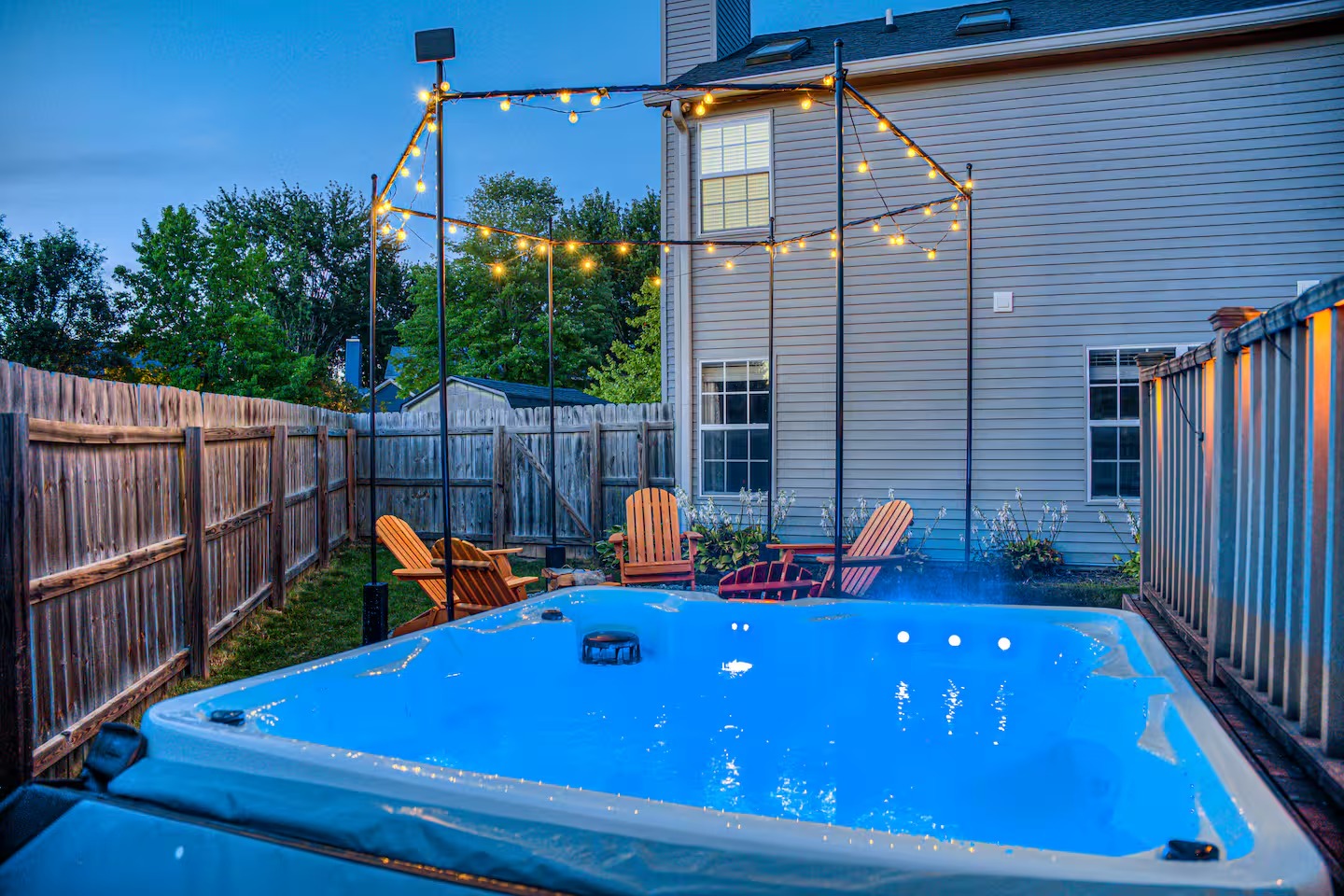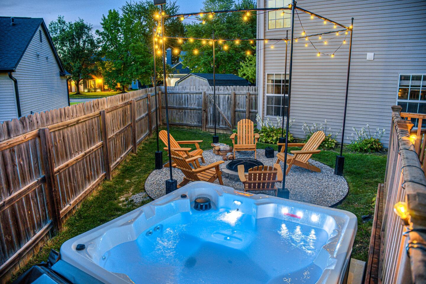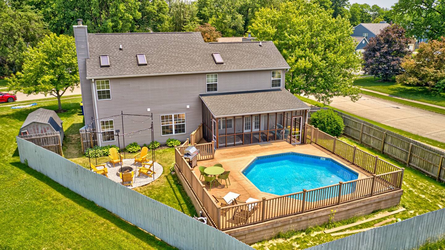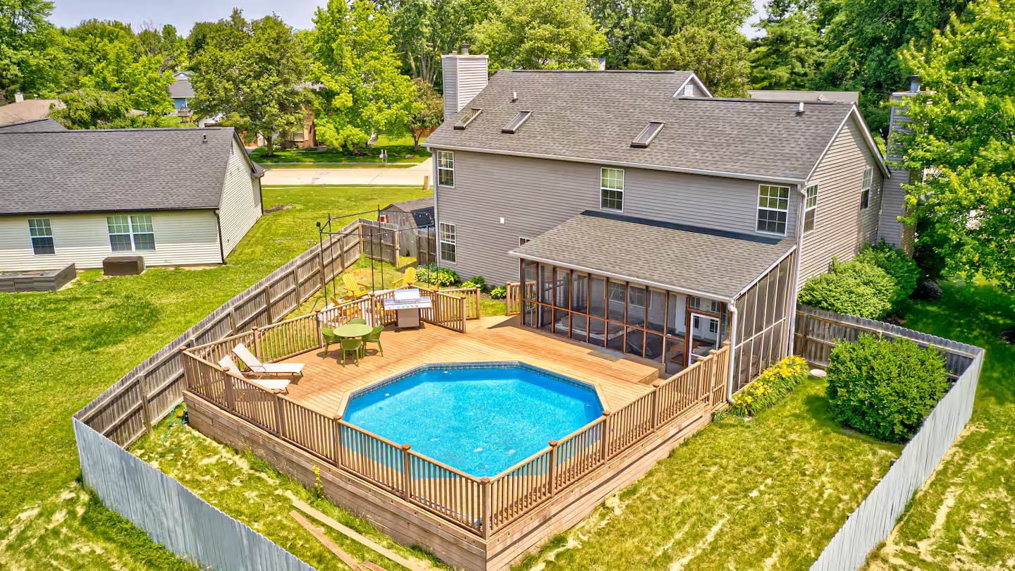 Welcome to this spacious 4-bedroom, 3.5-bath home located in a quiet, well-kept neighborhood near downtown Indianapolis. Designed for comfort and convenience, this home is perfect for families, large groups, business travelers, and long-term stays. Guests enjoy a private hot tub, seasonal above-ground pool, two cozy fireplaces, and a large open layout ideal for relaxing or gathering together. The home features fast high-speed WiFi, smart TVs, a smart thermostat, keyless entry, and both main-level and in-suite laundry for added ease. Additional family-friendly amenities include a dedicated children’s playroom, a fully fenced backyard, and pet-friendly accommodations. The fully stocked eat-in kitchen includes modern appliances, cookware, pantry essentials, a large island, and both casual and formal dining areas perfect for home-cooked meals or group dining. Centrally located near downtown Indianapolis with quick access to museums, theaters, shopping, restaurants, and major attractions. ✔Bedrooms & Sleeping Arrangements This home comfortably accommodates large groups with flexible sleeping options: Primary Suite: King-size bed, walk-in closet, and private en-suite bathroom with whirlpool tub and shower Bedroom Two: Two queen-size beds Bedroom Three: One queen-size bed Bedroom Four: Bunk bed setup (full/twin) or optional work-from-home space ✔Additional sleeping arrangements may be available upon request. ✔Kitchen & Dining Cook with ease in the fully equipped modern kitchen featuring: Full-size refrigerator, stove, oven, microwave, dishwasher, and disposal Pantry stocked with essentials, cookware, and tableware Large island with pendant lighting Eat-in breakfast area plus formal dining space Perfect for families, extended stays, and group meals. ✔Living & Entertainment Relax in the bright and spacious living room with comfortable seating and entertainment options including: Large smart TV with streaming services Accent chairs and ottomans for extra seating Board games and books for family fun Fireplace with modern décor and artwork ✔Bathrooms Enjoy three full bathrooms plus a convenient half bath, all stocked with essential amenities for a comfortable stay. ✔Outdoor Space Step outside to your private outdoor retreat featuring: Seasonal above-ground swimming pool Heated fiberglass spa hot tub Deck and screened porch Fully fenced yard for privacy and pets Outdoor seating and BBQ grill Perfect for relaxing evenings, family gatherings, or weekend fun. ✔Game Room Enjoy hours of entertainment in the arcade-style game room complete with: Pool table with pendant lighting 3-in-1 game table (air hockey, ping pong, and more) Comfortable seating, sofa, and bean bags Neon lighting and cushioned flooring for comfort Access is conveniently located through the laundry room off the kitchen. Kids’ Indoor Playroom A bright and fun-filled space designed just for children, featuring: Soft play equipment and safe flooring Age-appropriate toys and activities Child-sized table and chairs for crafts and games Large windows with natural light Comfortable seating for parents This family-friendly space ensures kids stay entertained rain or shine. ✔Parking & Access Guests enjoy easy self check-in with keyless entry and plenty of parking available in the private driveway and on the street. Whether you’re planning a family vacation, group trip, business stay, or extended getaway, this spacious pool home near downtown Indianapolis offers comfort, privacy, and top amenities. Reserve your stay today and experience the perfect balance of relaxation and convenience.