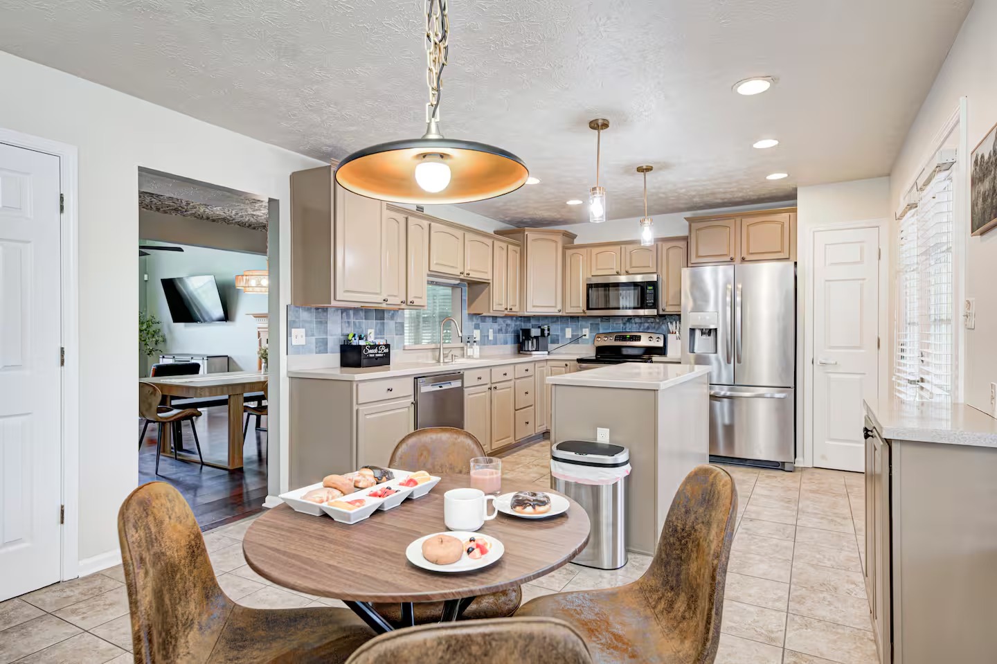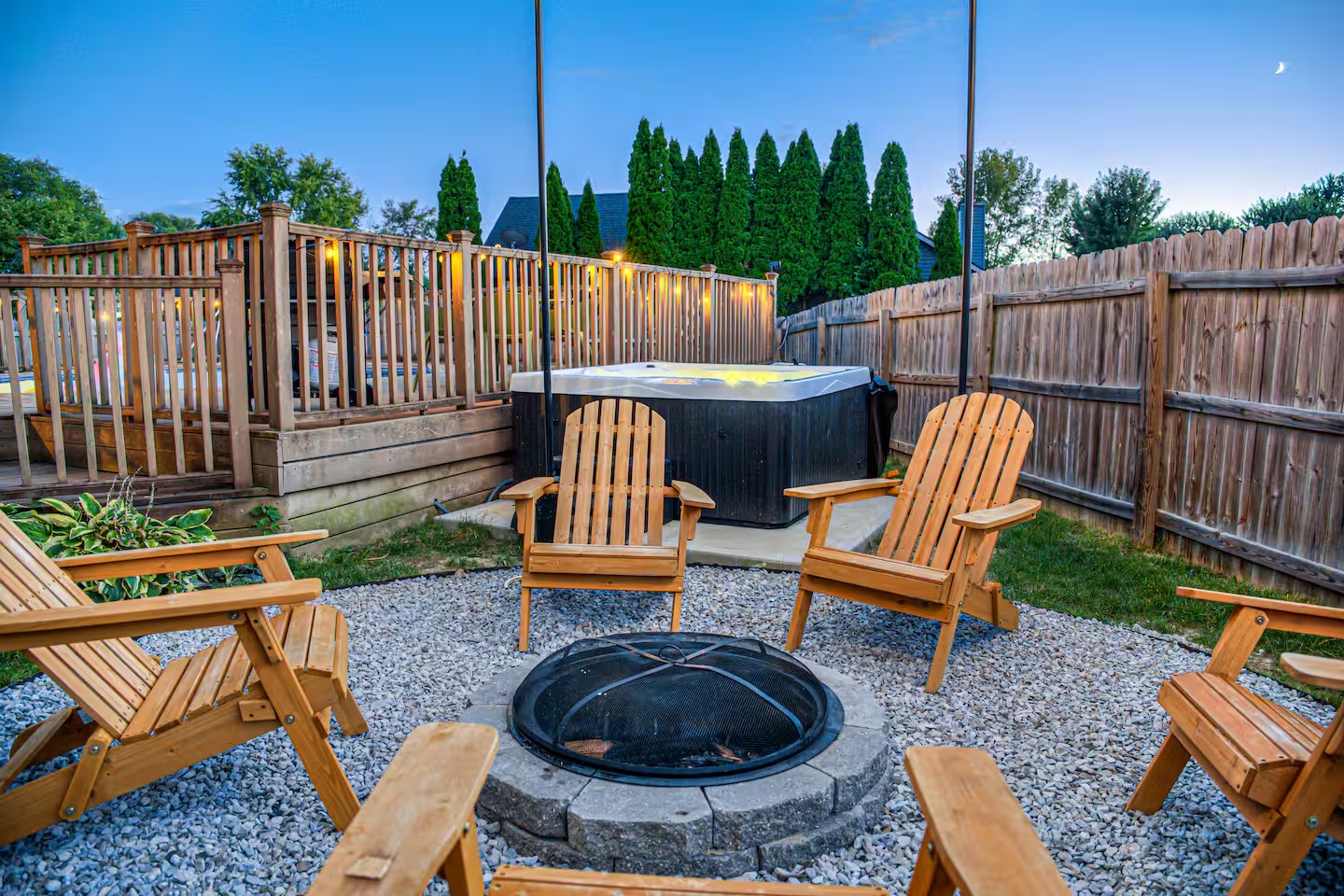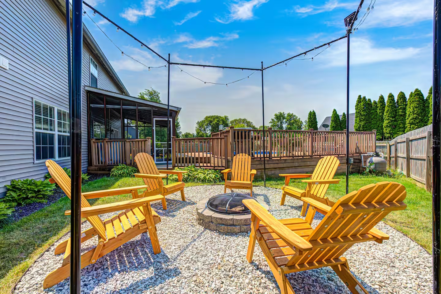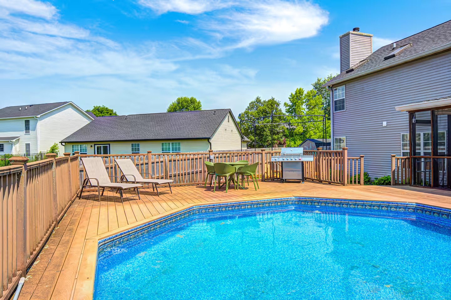 Welcome to this spacious 4-bedroom, 3.5-bath home located in a quiet, well-kept neighborhood near downtown Indianapolis. Designed for comfort and convenience, this home is perfect for families, large groups, business travelers, and long-term stays. Guests enjoy a private hot tub, seasonal above-ground pool, two cozy fireplaces, and a large open layout ideal for relaxing or gathering together. The home features fast high-speed WiFi, smart TVs, a smart thermostat, keyless entry, and both main-level and in-suite laundry for added ease. Additional family-friendly amenities include a dedicated children’s playroom, a fully fenced backyard, and pet-friendly accommodations. The fully stocked eat-in kitchen includes modern appliances, cookware, pantry essentials, a large island, and both casual and formal dining areas perfect for home-cooked meals or group dining. Centrally located near downtown Indianapolis with quick access to museums, theaters, shopping, restaurants, and major attractions. ✔Bedrooms & Sleeping Arrangements This home comfortably accommodates large groups with flexible sleeping options: Primary Suite: King-size bed, walk-in closet, and private en-suite bathroom with whirlpool tub and shower Bedroom Two: Two queen-size beds Bedroom Three: One queen-size bed Bedroom Four: Bunk bed setup (full/twin) or optional work-from-home space ✔Additional sleeping arrangements may be available upon request. ✔Kitchen & Dining Cook with ease in the fully equipped modern kitchen featuring: Full-size refrigerator, stove, oven, microwave, dishwasher, and disposal Pantry stocked with essentials, cookware, and tableware Large island with pendant lighting Eat-in breakfast area plus formal dining space Perfect for families, extended stays, and group meals. ✔Living & Entertainment Relax in the bright and spacious living room with comfortable seating and entertainment options including: Large smart TV with streaming services Accent chairs and ottomans for extra seating Board games and books for family fun Fireplace with modern décor and artwork ✔Bathrooms Enjoy three full bathrooms plus a convenient half bath, all stocked with essential amenities for a comfortable stay. ✔Outdoor Space Step outside to your private outdoor retreat featuring: Seasonal above-ground swimming pool Heated fiberglass spa hot tub Deck and screened porch Fully fenced yard for privacy and pets Outdoor seating and BBQ grill Perfect for relaxing evenings, family gatherings, or weekend fun. ✔Game Room Enjoy hours of entertainment in the arcade-style game room complete with: Pool table with pendant lighting 3-in-1 game table (air hockey, ping pong, and more) Comfortable seating, sofa, and bean bags Neon lighting and cushioned flooring for comfort Access is conveniently located through the laundry room off the kitchen. Kids’ Indoor Playroom A bright and fun-filled space designed just for children, featuring: Soft play equipment and safe flooring Age-appropriate toys and activities Child-sized table and chairs for crafts and games Large windows with natural light Comfortable seating for parents This family-friendly space ensures kids stay entertained rain or shine. ✔Parking & Access Guests enjoy easy self check-in with keyless entry and plenty of parking available in the private driveway and on the street. Whether you’re planning a family vacation, group trip, business stay, or extended getaway, this spacious pool home near downtown Indianapolis offers comfort, privacy, and top amenities. Reserve your stay today and experience the perfect balance of relaxation and convenience.