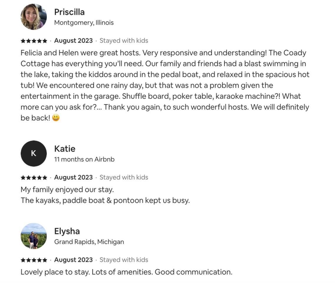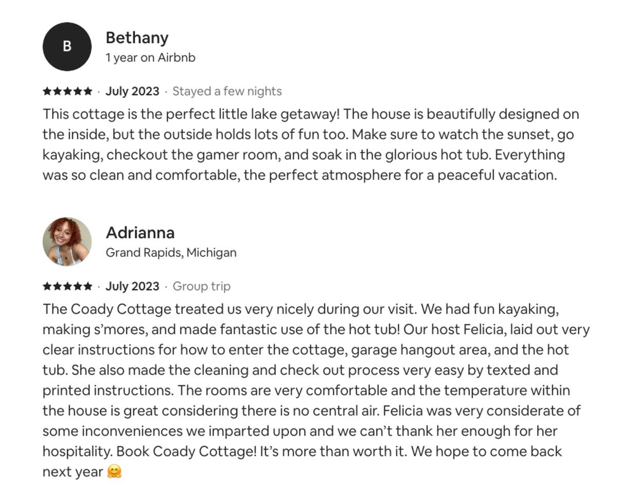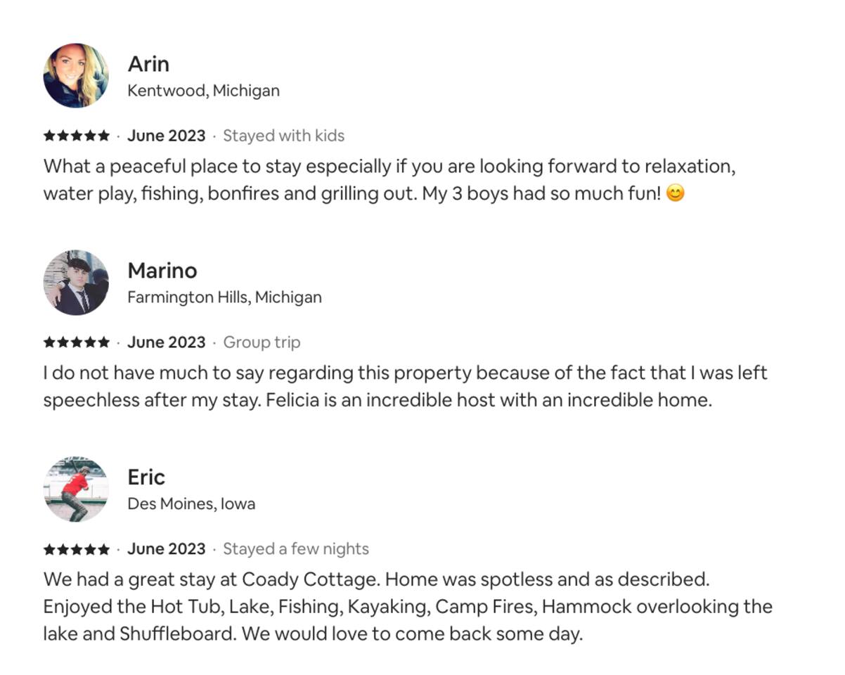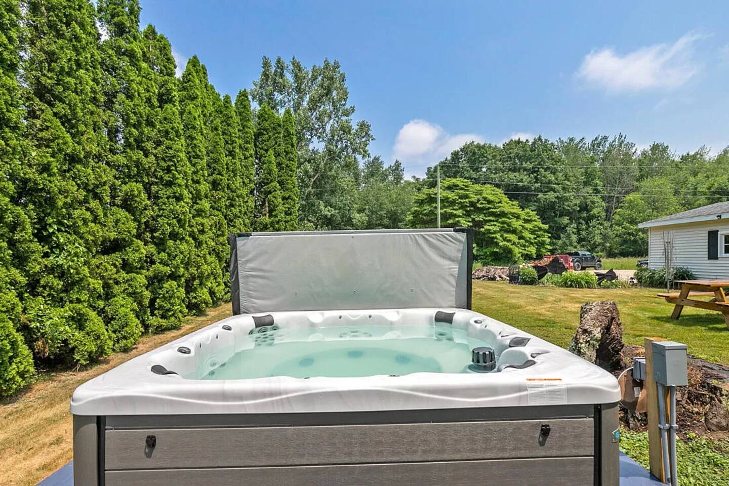 ## Coady Lake Cottage - Your Lakeside Escape ## ✔ Relaxing 4 Bedrooms ✔ Amazing 8-person Hot Tub ✔ Lake View with Private Boat Dock ✔ Free Kayaks, Paddle Boat & games ✔ BBQ Grill ✔ Sleeps Up to 12 Guests ✔ Fully Stocked/Equipped Kitchen ✔ Smart TVs in the living room ✔ In Suite Laundry ★ GREAT AMENITIES ★ Relax in the 8-person hot tub under the stars, letting the warm water and gentle breeze melt your worries away. Gather in the spacious garage hangout. Play shuffleboard or darts, sing karaoke, or enjoy a game of corn hole. Prefer something quieter? Play a classic card game at the dedicated table. Hang a hammock by the water and sway in the breeze, enjoying the calming sounds of nature. Let your worries drift away at Coady Lake Cottage. ★ SLEEPING ARRANGEMENTS ★ The cottage sleeps up to 14 guests, perfect for families or large groups. Three bedrooms with queen beds, a bunkroom with two sets of bunk beds and there's a queen air mattress, pack-n-play, and fold-out chair bed for extra sleeping options. ★ DINING & ENTERTAINMENT ★ Cook delicious meals in the fully stocked kitchen with all the appliances and cookware you need. Enjoy your meals in the dining room with stunning lake views. Relax in the living room with a smart TV or curl up with a book in the sitting area, both with beautiful lake vistas. ★ LAUNDRY ★ Use the on-site laundry room to keep your swimsuits and beach towels fresh. Ramp access makes it easy for all guests to move around the cottage. ★ PETS ★ Dogs only no cats allowed. Any pet above 50lbs needs special approval from the host. Book your stay today and experience the magic of lakeside living at Coady Lake Cottage! Contact us to check availability and rates, and start planning your unforgettable escape.
